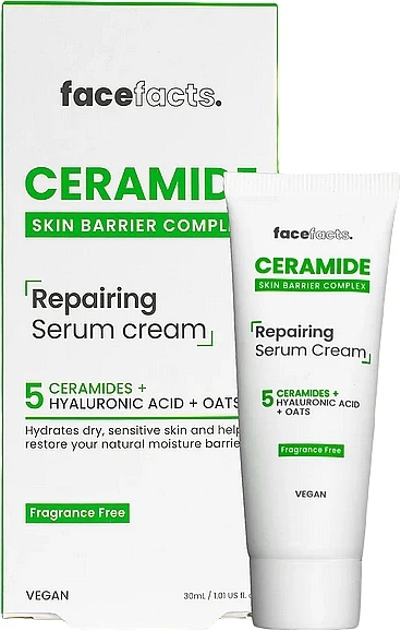 Face Facts Ceramide Moisturising Gel Cream is formulated with a skin barrier complex of 5 Ceramides, moisture-locking Hyaluronic Acid, hydrating Vitamin E, and soothing skin Oats.